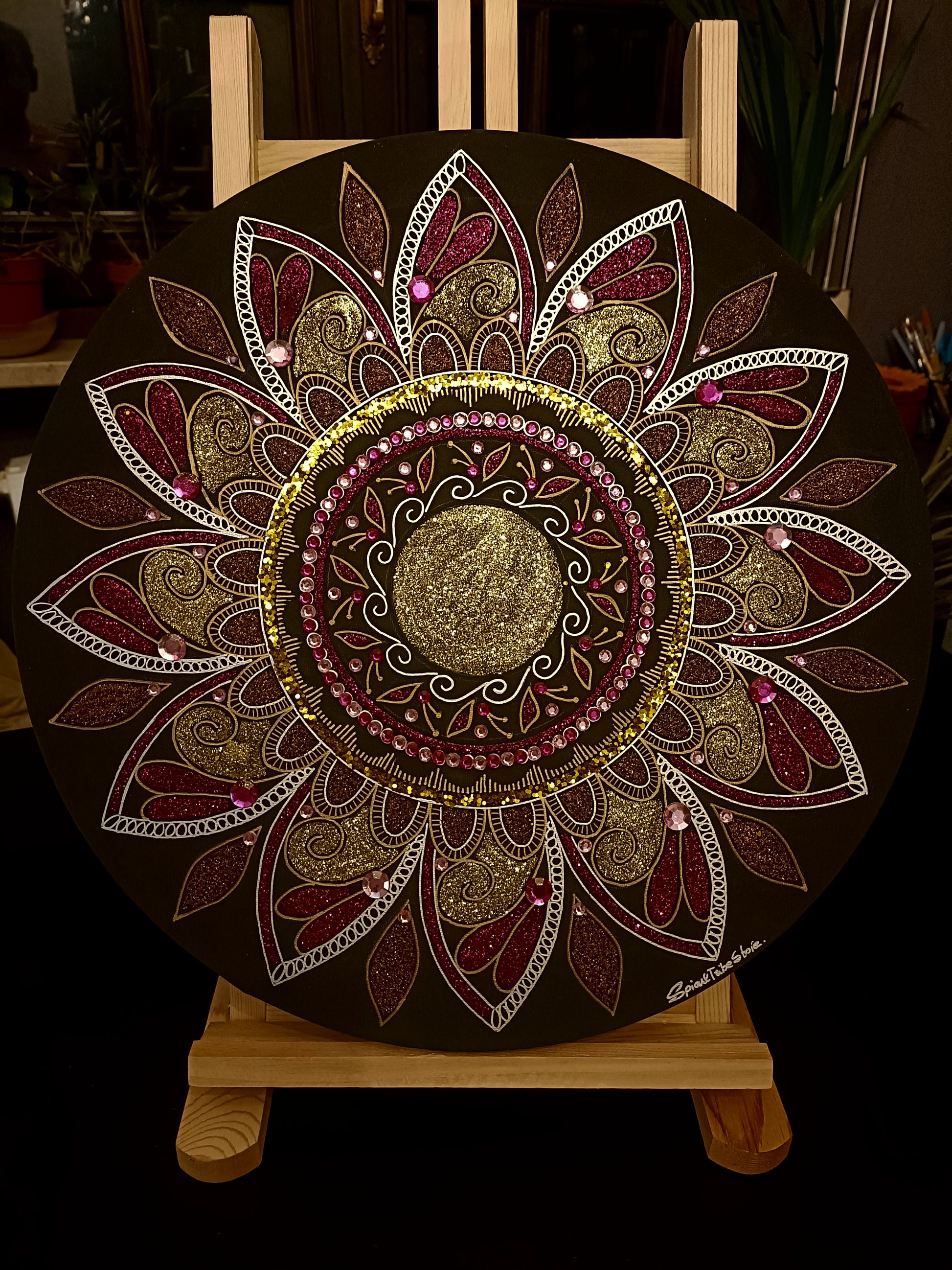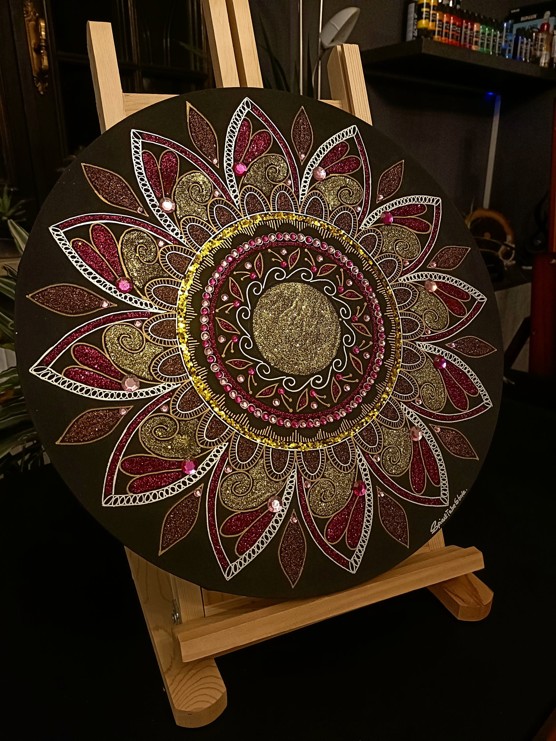 Con sfondo in acrilico nero e disegno realizzato ad inchiostro oro e argento con dettagli in glitter e perline rosa e fucsia.