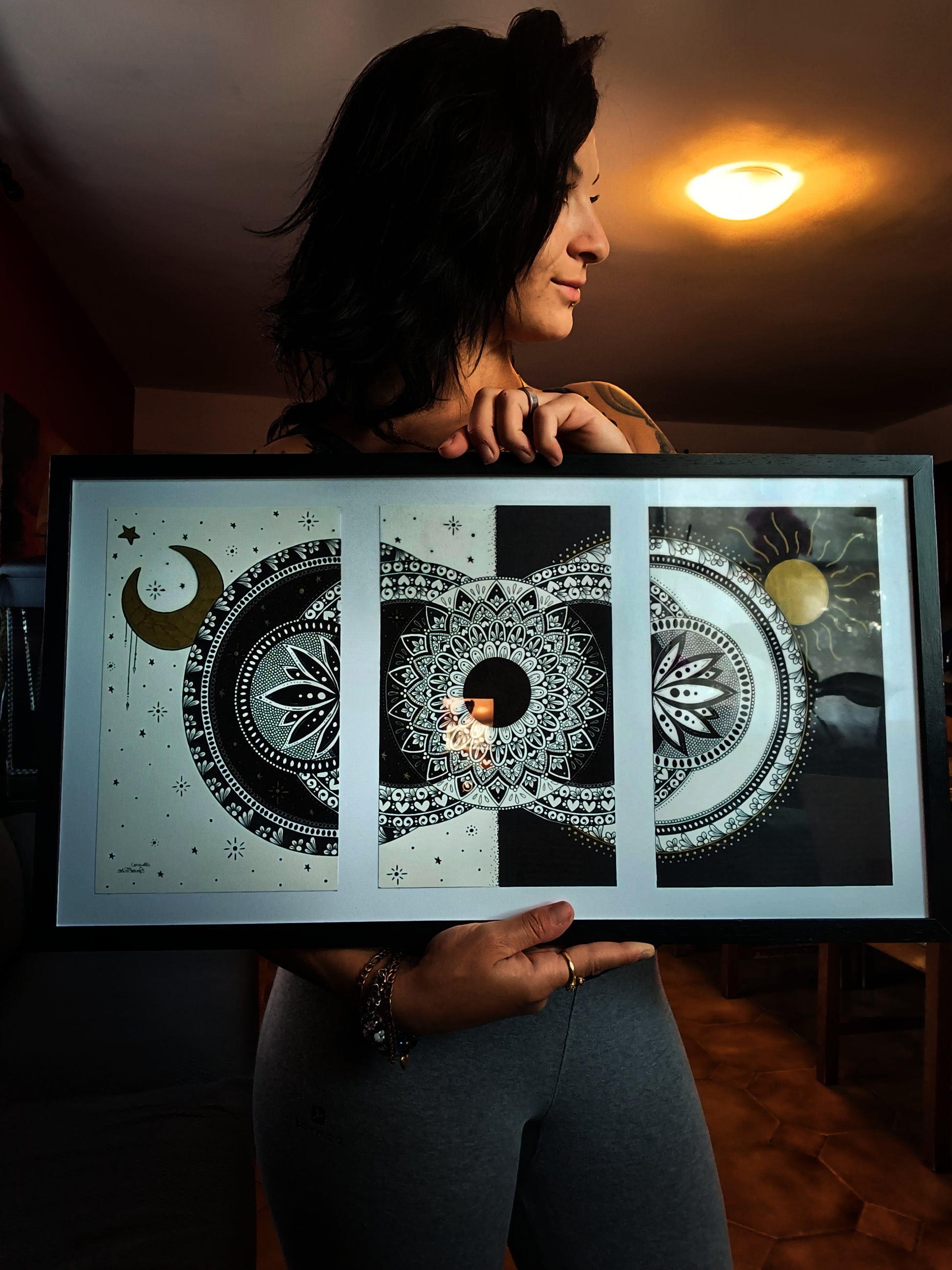 Mandala design realizzato ad inchiostro su cartoncino, incorniciato su cornice color nero opaco.